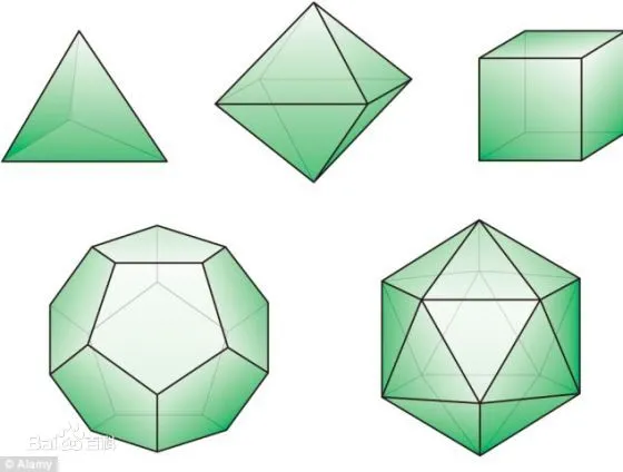正4面体 4*3边形、正6面体 6*4边形、正8面体 8*3边形、正12面体 12*5边形、正20面体 20*3边形。正多面体。